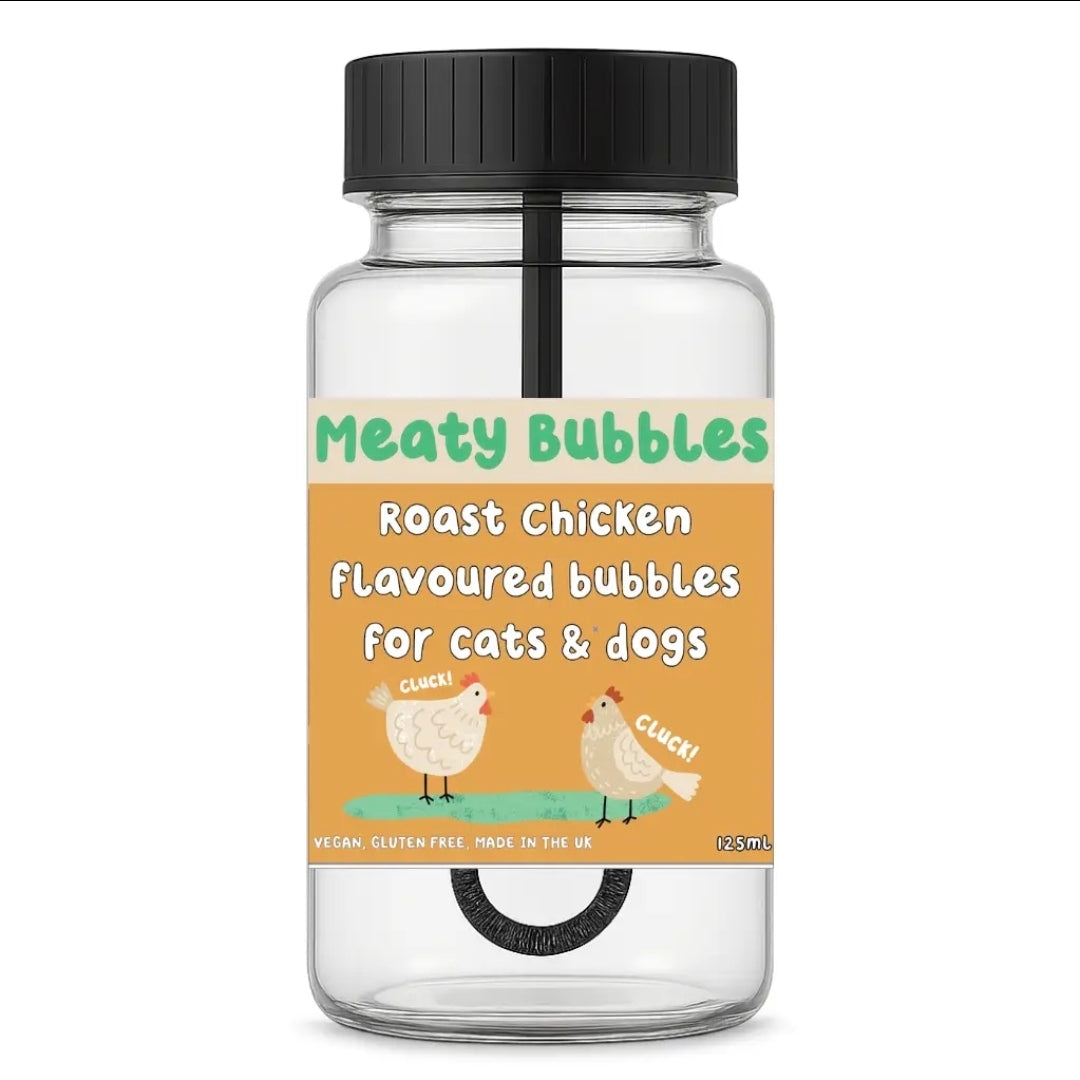Roast Chicken flavoured bubbles are not only non-toxic and safe for pets, but also enriched with an irresistible scent and flavour that will keep your furry friend entertained and engaged. The rich aroma and flavour of chicken is sure to excite your pet's senses and encourage them to play. These bubbles are also an excellent way to provide mental stimulation and physical activity for your pet, helping to promote overall health and wellness. So go ahead, make playtime even more fun for your furry friend with our chicken flavoured pet-friendly Meaty bubbles™️.